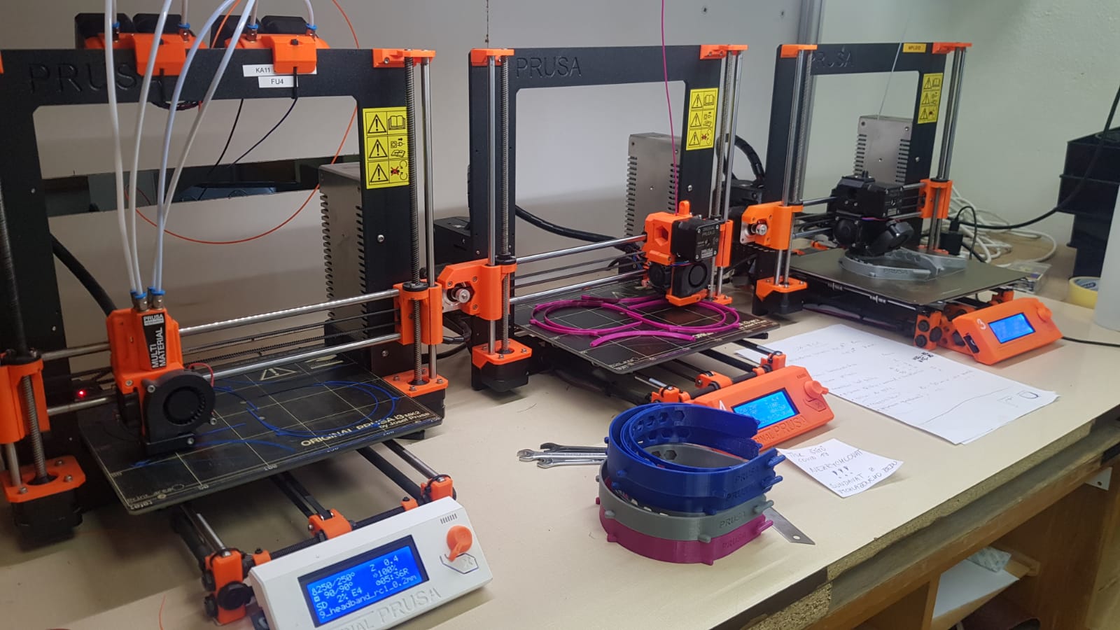 V tuto chvíli pro FabLab tiskneme na všech našich tiskárnách komponenty pro sestavení ochranného štítu.