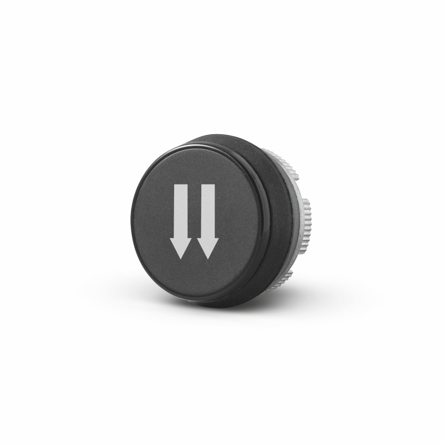 Popis: Tlačítko závěsného ovladače DOLŮ RYCHLE jednoryclostní, bílý znak na černém podkladu.