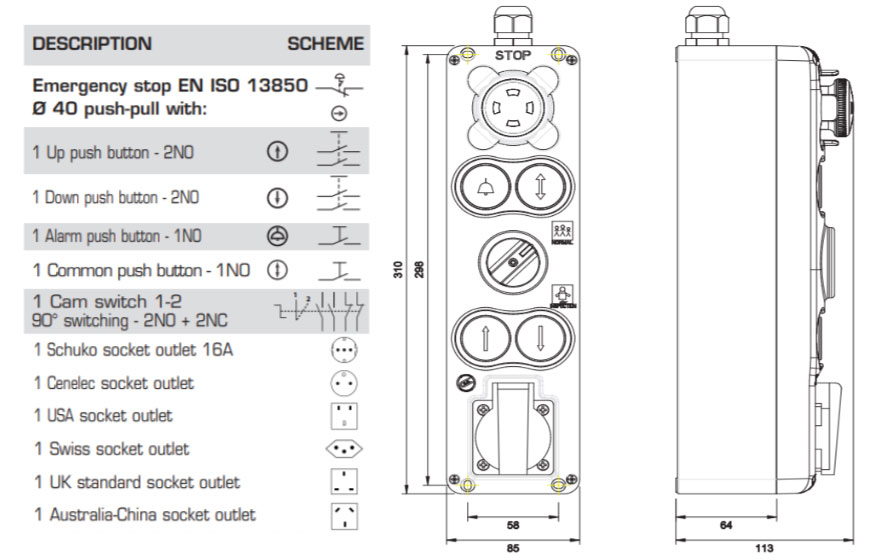 GM750/FR - rev. jízda s přepínačem 2NO, 2NC; GM751 - rev. jízda bez zásuvky 230V/DC.