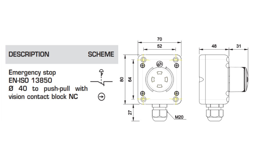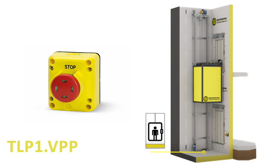 Stop tlačítko v krabičce s aretací, s funkcí tahem povolit. Ve výtahovém segmentu se používá do prohlubně výtahové šachty. Součástí korpusu krabičky je ochranný "límec", který brání náhodnému znovu spuštění stop tlačítka. Stop tlačítko má mechanicko - vizuální kontrolu stavu pomocí čtyř výřezů z transparentního plastu. Při běžném provozu je ve výřezech vidět zelený podklad, při vybavení stop tlačítka je vidět podklad červený. Pod stop tlačítkem je vždy min 1NC s nuceným vedením kontaktů. Stop tlačítko má mechanickou ochranu proti nechtěnému spuštění, kterou stanovuje odborná norma (EN).